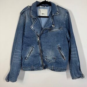 Zara Denim Blue Moto Biker Jean Jacket Distressed Jacket Size L