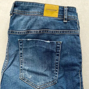 Zara Denim/ Cropped blue skinny jeans/ Gemstone sides/ Distressed/ Size US 12