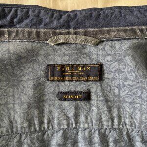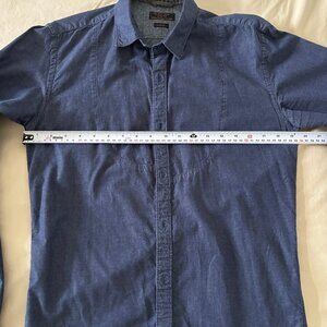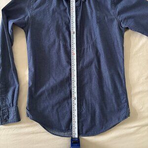 A casual denim shirt featuring a bib-shaped stitching design on the front, soft point collar, standard front placket, and a cool floral pattern on the inside, which can be shown off by rolling up the sleeves. The color is slightly colder and more metallic in person — pardon the lighting.