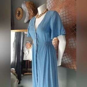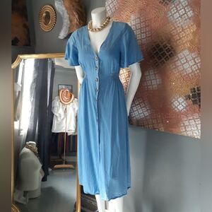 button down cotton and lyocel blend fine denim midi dress from Zara. great condition, only worn a couple times. no flaws to note. material label has been removed but is a cotton, lyocel blend. tortoiseshell button details with flutter sleeves and elastic ruching at waist. mid wash blue in colour. deep v neck. size xs but should fit size small as well. see flat lay measurements below!