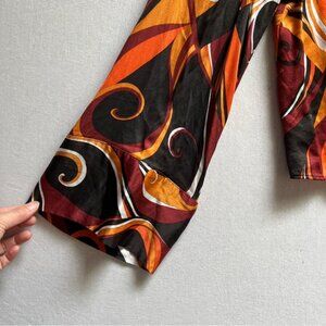 Chic blouse with abstract design. Features orange, black, and red tones. Ideal for a standout look.