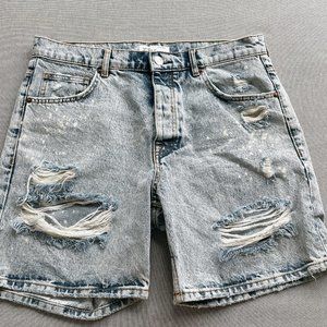Stylish distressed denim shorts. Features frayed details. Classic five-pocket design. Button closure.