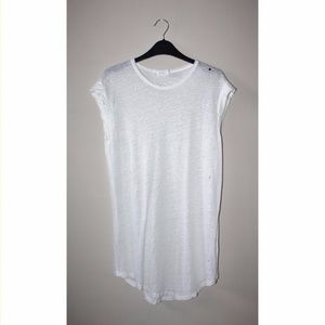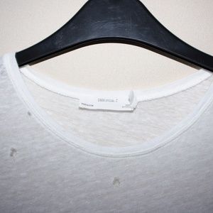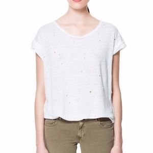 Ivory semi-sheer linen top with distressing and holes throughout, scoop neck, and cap sleeves from Zara