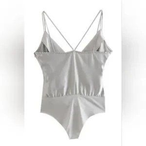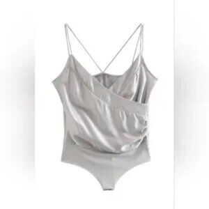 Zara Dove Gray Satin Bodysuit Strappy Sexy Wrap V-Neck Dressy Blouse Size XS