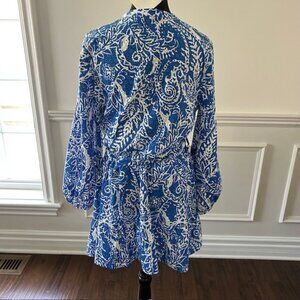 Short dress with a round neck and v-neck. Long puffed sleeves. Perforated embroidery detail. Contrast belt with round buckle. Matching lining. Button-up front.