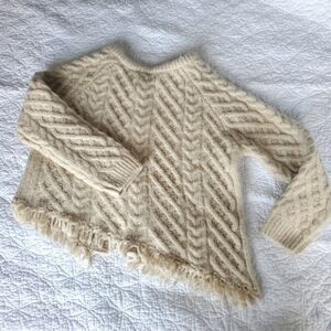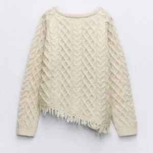 Zara Ecru Chunky Wool Blend Asymmetrical Knit Buttoned Frayed Hem Sweater