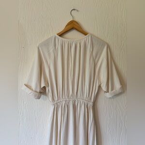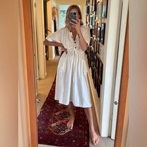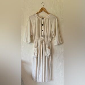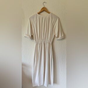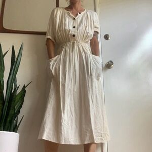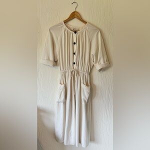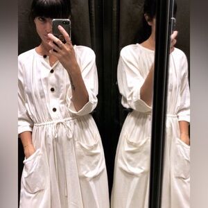 Zara Ecru Off White Cream Button Up Down Drawstring Pocket Linen Midi Dress