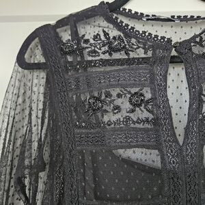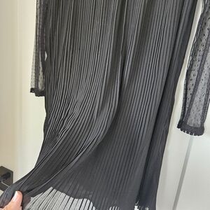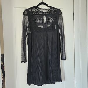 Elegant black dress with lace details. Sheer long sleeves. Ideal for formal events.