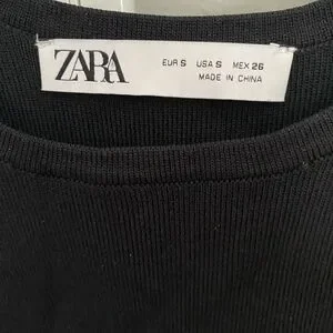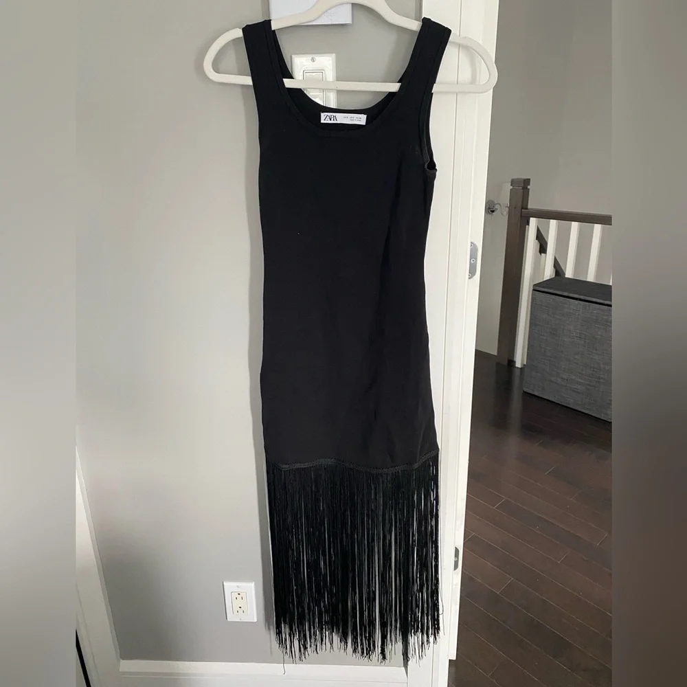 Stylish black midi dress by Zara. Features elegant fringe detailing. Ideal for versatile occasions.