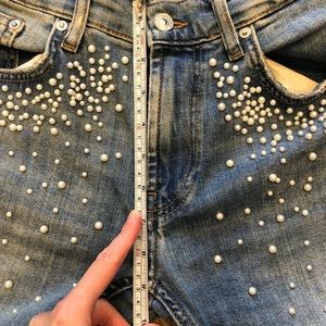 Medium blue, slight stretch (3%), mid-rise, cropped (26”). Pearl embellishments. Super comfy!