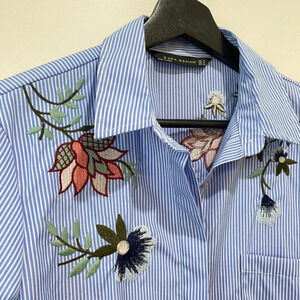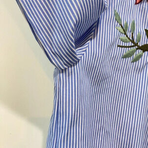 Zara Embroidered Floral Striped Blue and White Women's Button Dress Shirt Size M