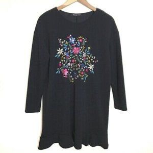 New without tag size small, Zara Woman navy blue long sleeve shift dress. Embroidered and sequin floral detailing on the center of dress very flattering, beautiful dress to compliments your feminine classy minimalist fashion style look with floral embroidered detailing in front with raffle hem, measurements with dress flat lay pit-pit 21.5”, sleeve 18.5”, dress length 35”, floral tunic mini embroidered sundress