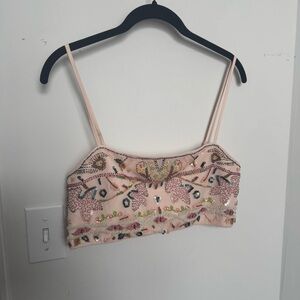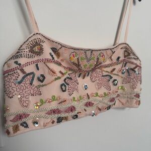 Zara Embroidered sparkly beaded Beige Crop Top mesh fairycore summer L