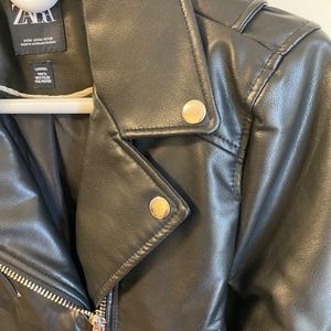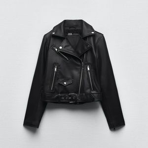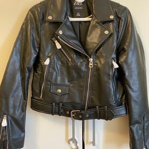 Lapel collar jacket with long sleeves with epaulettes. Front pockets with zip closure. Tonal belt with metal buckle at hem. Front asymmetric zip closure. Never worn but Tag fell off, all zippers have protective tissue covering from when I first bought the jacket.