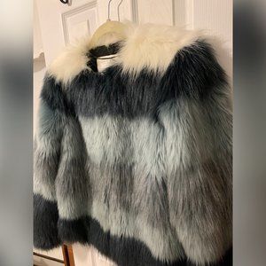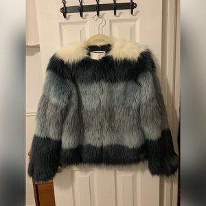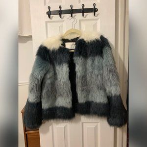 A faux fur striped jacket perfect for fall, winter and spring. Wear with jeans would be a perfect match! **Notice** There are some stain on the armpit level.