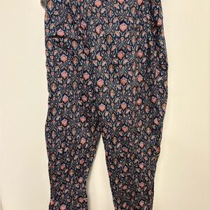 Stylish floral ankle pants. Features a pink and blue pattern. Comfortable fit with drawstring waist. Perfect for casual outings.