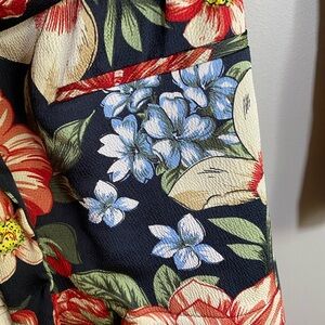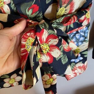 Beautiful and very vibrant floral belted blazer/jacket. Gold accent buttons on the sleeves. Faux pocket detailing on the front.