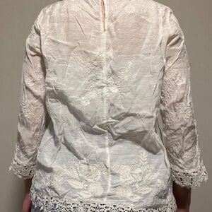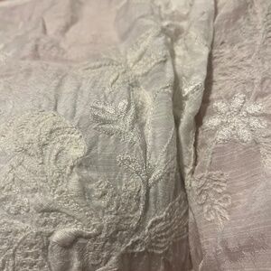 White with floral embroidery and lace on trim. Semi-sheer. No tag, great condition, never worn.
