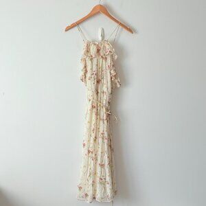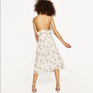 Gorgeous floral ruffle midi dress from Zara. Features sparse sequin decorations allover, ruffle at neckline, open back, elastic waist. Lined