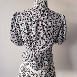 Zara Floral Wrap Tie Around Crossover Crop Top Shirt Blouse Short Sleeve White with Black Red S