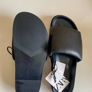 Zara Real Genuine Black Leather Padded Flat Sandals