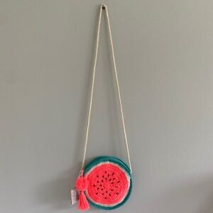 Small crossbody knit watermelon purse. Super cute tassel, pompom, & bead details. Neon coral inner lining. New with tags, never used, & in great condition.
