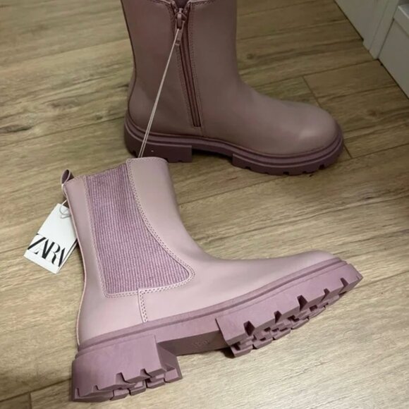Zara girls rubber ankle boots. Lug soles. Starfit technical insole. Side zip closure. Back pull tab for ease. Monochromatic pastel.