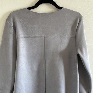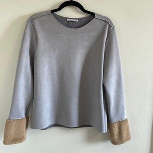 Stylish gray blouse with tan cuffs. Perfect for casual or formal wear.
