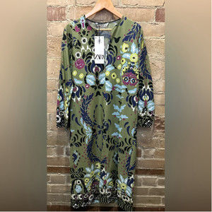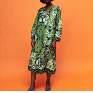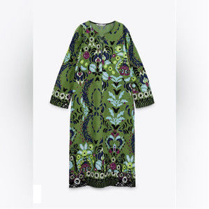 Vibrant green midi dress with floral patterns. Long sleeves and V-neckline. Perfect for a stylish look.