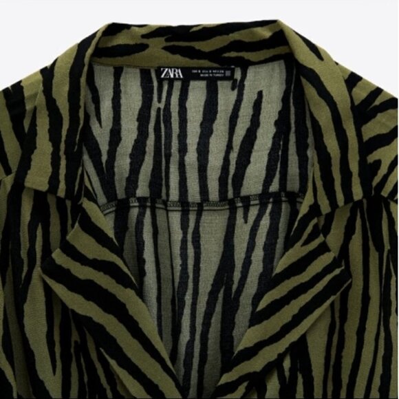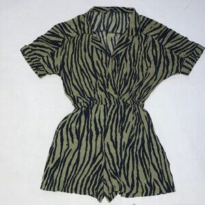 Zebra print. Army green. Animal print. Trendy. Casual chic. Versatile. Preppy. Breathable. Lightweight. Comfortable. Coastal. Cottagecore. Fall essential. Minimalist. Short jumpsuit.