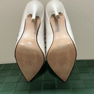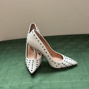 One small mark on back of one shoe see pic. The Zara Studded Stiletto Cream heels in size 9 are stylish and versatile shoes perfect for a party or cocktail event. With a pointed toe and studded accents, these slip-on pumps are designed to make a statement. The ivory color adds a touch of elegance, while the stiletto heel provides a classic and chic look. Made of manmade material, these lightweight heels are perfect for wearing in the summer, fall, or spring seasons. The Zara brand is known for its trendy and quality footwear, making these studded stiletto heels a must-have addition to any woman's shoe collection.