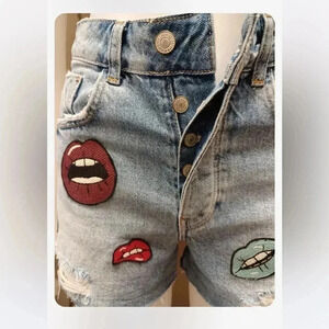 Zara High Rise Distressed Lip Appliqués Patches Denim Shorts Size 02