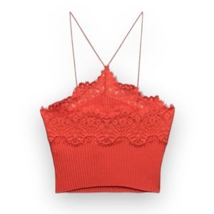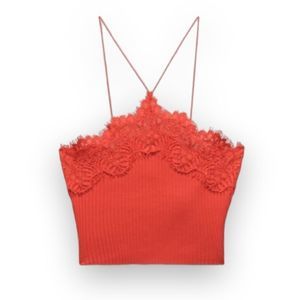 Zara Intense Red Lace Ribbed Halter Crop Top US Small