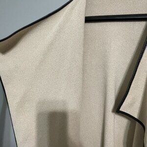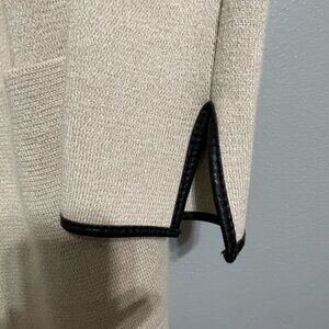 An open-front sweater in a neutral cream hue, beautifully detailed with faux leather trims and two front patch pockets. Crafted from a heavy knit fabric, its classic straight silhouette makes it a stylish and cozy alternative to your everyday coat or jacket.