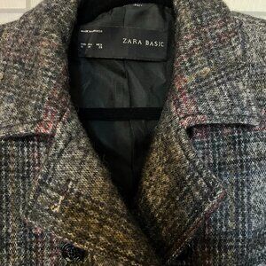 Zara jacket, Size Small, used but in good shape. Grey multicolored wool blend plaid coat jacket. Missing the two last buttons.