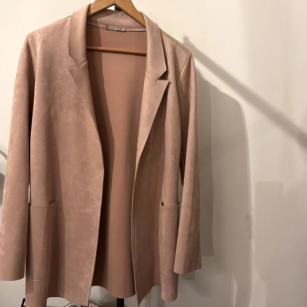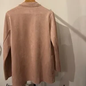 Muted pink. Great condition. Soft suede ( 92% polyester)