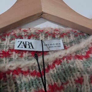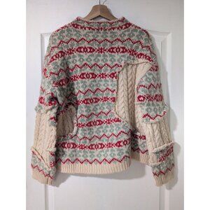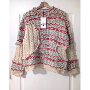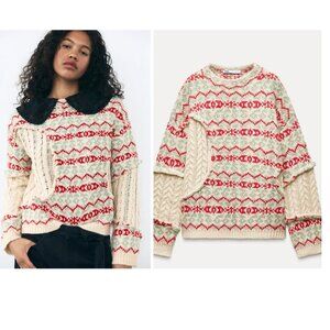Crew neck sweater with long sleeves. Contrast jacquard detail with a cable pattern.