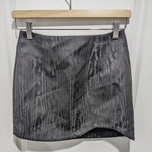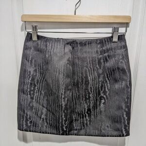 high waisted mini skirt with hidden in seam zipper. jacquard semi-sheen fabric in black. size Small approx measurements waist - 13" length - 14"