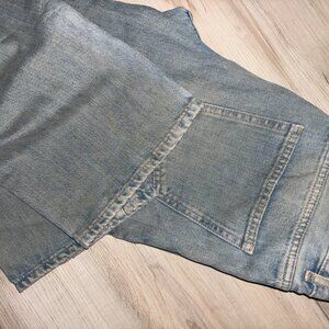 Light- medium faded blue wash with brown gasoline finish, zipper fly, oversized relaxed fit.