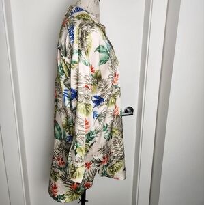 Pearlecent Shell button front & cuffs, notched high-low hemline, Palm fronds, Leopards, Tigers, Excellent Condition, no material tag (100% poly), Size XS fits more Like a Loose M/L, Drop Shoulder-24, Pit-22, Sleeve-18, Length-21 (top of side slit), 30 (Back Hemline).