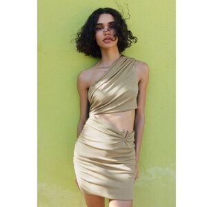 Zara ruched dress. Golden/light brown/khaki colour. Cut out in the middle and one shoulder.