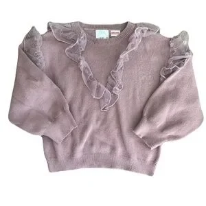 Charming pink sweater with lace ruffle accents. Soft and stylish for any occasion.