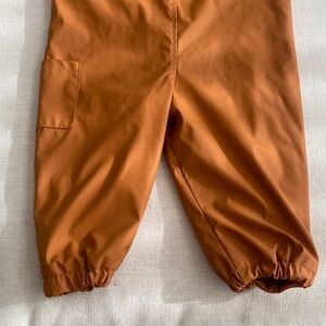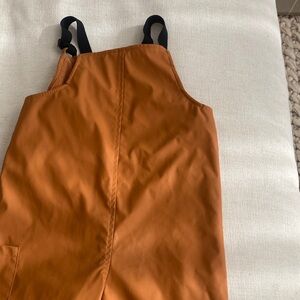 2-3T. These are so handy and great for splashing. Waterproof. Only a small flaw on front as shown. Stylish and sturdy overalls for kids. Features a rich rust color. Ideal for active play.