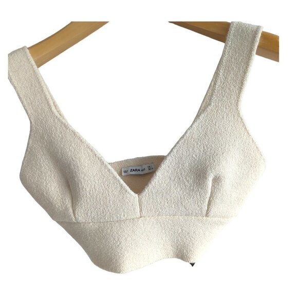 This is a cream coloured stretchy knit cropped bra top by Zara Knit.