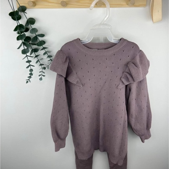 Chic purple knot sweater with delicate ruffle accents and matching pants. Size 4/5