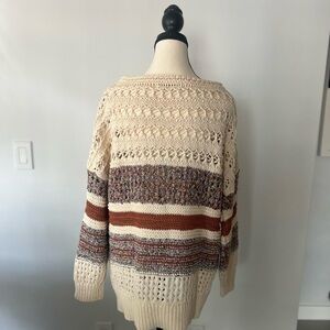 This Zara oversized knit sweater offers a relaxed fit with long sleeves and a bold contrast design. The round neckline adds to its effortless, laid-back style, making it the perfect cozy yet chic piece for any casual look. Can also be worn off the shoulder!