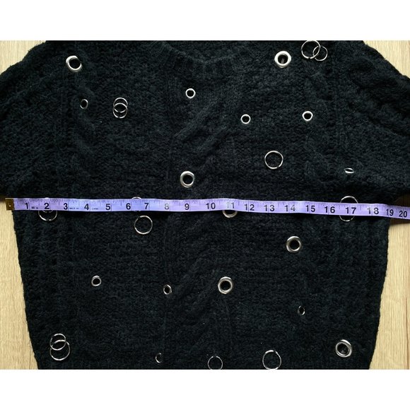 Black crewneck knit pullover with cables, eyelets, and silver hardware – grommets (with holes in the middle) and rings sewn into the yarn. Slightly oversized fit, slightly cropped. Yarn was manufactured to be a little bit fuzzy or hazy. A super interesting piece.