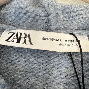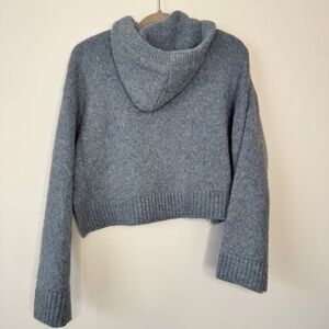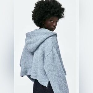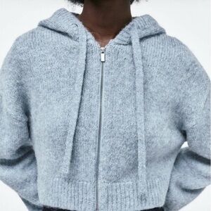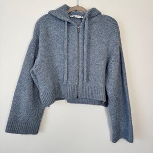 Zara Knit Zip Up Sweater Heathered Blue Alpaca Wool Blend Cropped Hooded Sz M L