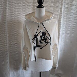 A cool and comfortable Zara cropped hoodie perfect for a casual, streetwear look. This top features a bold LA graphic print in black against a soft cream/off-white fabric with black drawstrings. The material has some stretch.