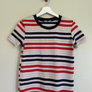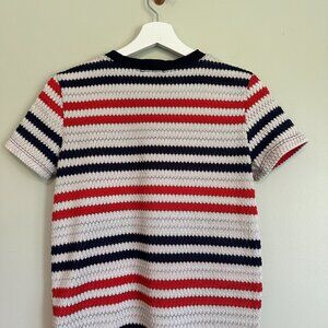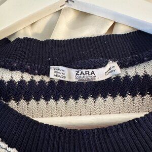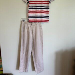 This set consists of a striped Zara top and classic khaki L.L. Bean pants. The Zara top is in fabulous condition. It is cream, navy and burnt orange with a striped pattern. The L.L. Bean pants are in perfect condition, classic fit, with button detail at the waist and belt loops.